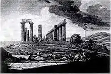 The work shows the 460-450 BC Temple of Hera Lacinia in the Valle dei Templi in Agrigento, Sicily, sacked by the Carthaginians around 406 BC, rebuilt by the Romans and the subject of renewed interest for classicists and antiquarians from the mid 18th-century onwards. It was visited by both Jacob Philipp Hackert and Johann Wolfgang von Goethe, with the latter writing in his letters "The current view of the Temple of Juno is as gritty as one could wish for".[1] However, Friedrich never visited Italy and produced the work from a print by another artist.