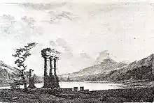 An ancient temple is a rare but not unique motif in the artist's work. Around 1803 he produced the etching Landscape with Temple Ruins.,[20] possibly created according to Hirschfeld's Theorie der Gartenkunst (Theory of Garden Art).