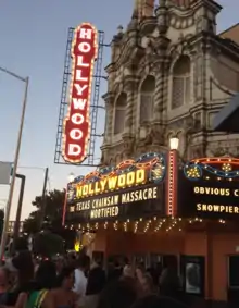 The Texas Chain Saw Massacre premiered in Austin, Texas, on October 1, 1974, almost a year after filming concluded. It screened nationally in the United States as a Saturday afternoon matinée and its false marketing as a "true story" helped it attract a broad audience.[48][49] For eight years after 1976, it was annually reissued to first-run theaters, promoted by full-page ads.[50] The film eventually grossed more than $30 million in the United States and Canada[51] ($14.4 million in rentals), making it the 12th highest-grossing film initially released in 1974, despite its minuscule budget.[52] Among independent films, it was overtaken in 1978 by John Carpenter's Halloween, which grossed $47 million.[53]