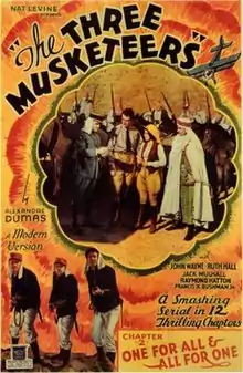 The Three Musketeers (aka Three Musketeers) is a 1933 American pre-Code film serial directed by Armand Schaeffer and Colbert Clark, and produced by Nat Levine for Mascot Pictures.[1] The film serial was very loosely based on Alexandre Dumas' 1844 novel The Three Musketeers, with the musketeers changed into three soldiers in the French Foreign Legion, and d'Artagnan being reconfigured as Lt. Tom Wayne (played by John Wayne), a pilot in the United States military.[2][3]