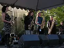 The Tiptons Sax Quartet, previously known as The Billy Tipton Memorial Saxophone Quartet, is a jazz saxophone quartet from Seattle, Washington. The ensemble consists of five members (the fifth member being the quartet's drummer and percussionist). The name of the quartet was inspired by Billy Tipton, a jazz pianist and saxophonist, who upon his death was revealed to be anatomically female.[1] Formed in 1988, they have toured frequently in North America and Europe, collaborated with Pat Graney Dance Company,[2] taught workshops on improvisation and composition, and have recorded eight CDs.