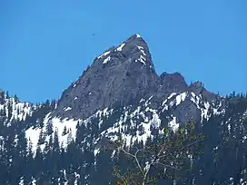 The Tooth is the descriptive name for a 5,604 ft, fin-like, andesite pillar located in King County of Washington state.[2] It is part of the Cascade Range and is within the Alpine Lakes Wilderness. The Tooth is located northwest of Snoqualmie Pass and the Alpental ski area on land managed by Mount Baker-Snoqualmie National Forest. The nearest higher peak is Bryant Peak, 0.44 miles (0.71 km) to the northwest.[1] Originally called Denny Horn and Denny Tooth, The Tooth became the officially recognized name in 1918, with Denny referring to its position on the high ridge between Denny Mountain and Chair Peak. The Tooth is a popular rock climbing destination, even in winter. The easiest route is class 4 scrambling, but solid rock provides technical routes, with the South Face considered a classic 5.4 climb that was first done in 1928 by Anderson and Wunderling.[3]