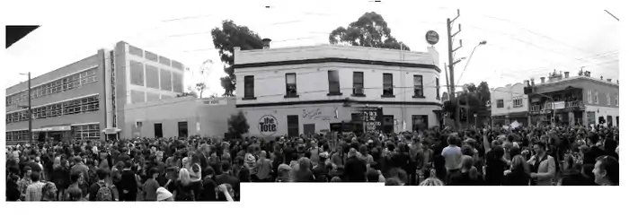 At 6pm on Sunday, 17 January, an estimated crowd of between 2,000[21] and 5,000 rallied outside the Tote, filling the intersection of Johnston and Wellington Streets and spilling down each street.[22] People found other vantage points on rooftops, upper story windows and balconies in the surrounding buildings. Amongst the crowd were amateur and professional photographers, film makers, a Tote documentary crew, various local independent music celebrities and a large collection of Melbourne's local independent musicians, patrons, long-time Tote patrons, former employees and others.