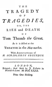 The Tragedy of Tragedies was an expanded and rewritten version of Tom Thumb. Fielding altered the play because although audiences enjoyed the play they did not notice the satire directed at the problems of contemporary theatre; the rewrite was intended to make the satire more obvious. The play was first performed on 24 March 1731 at the Haymarket Theatre in London, with the companion piece The Letter Writers. Its printed edition was "edited" and "commented" on by Fielding's pseudonym H. Scriblerus Secundus, who pretends not to be the original author.[1] It contains a frontispiece by Hogarth, which serves as the earliest proof of a relationship between Fielding and Hogarth.[2]