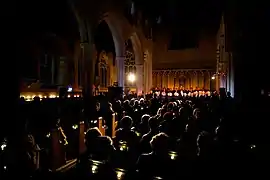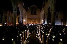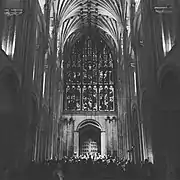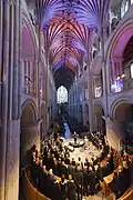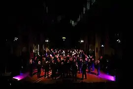 This site-responsive piece took place in Norwich Cathedral on 23 January 2017 – making extensive use of the space in a carefully choreographed promenade performance. The seating was removed from the nave to allow the performers to move freely throughout the space and to increase the effect of the lighting design. There was a choir of 150 and an estimated audience of 500 across two performances.[8]