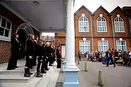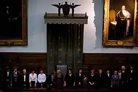 Full choir on the steps of the entrance to the Hall.
