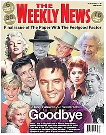 The Weekly News[1] was a British national newspaper founded in 1855 and published every Wednesday[2] by the Dundee newspaper chain DC Thomson.[3] Billed as "the paper with the feelgood factor," it contained news and features on a broad range of subjects in six colour-coded sections: That's Real Life, Entertainment, Lifestyle, Puzzles, Short Stories and Sport.