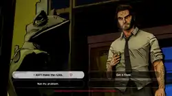 The Wolf Among Us is a graphic adventure game, played from a third-person perspective.[12] The player controls protagonist Bigby Wolf, who must investigate a series of mysterious murders.[13] Throughout the game, the player explores various three-dimensional environments, such as apartment buildings and a bar.[14] When exploring an environment, the player may find an object they can interact with; when this occurs, they must move a cursor over the object to select and examine it.[15] Items of interest are stored in an inventory, and can be used later in the story.[16] The player may also talk with non-player characters, and see the conversations presented in the form of dialogue trees.[17] The dialogue options chosen during conversations would either have a positive or negative effect on how other characters view Bigby, and their perceptions would influence future events in the story.[16] Some scenes are more action-oriented, forcing the player to respond to a series of quick time event (QTE) prompts.[18] The player is not required to complete every QTE prompt, and skipping certain prompts may affect future events in the story.[19]