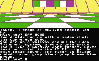Another difference is that the player has only seven days, within the game's clock, to complete the game. Quests are also time-based and require that the player arrive at certain locations at specific hours to achieve the desired goal. And while game play remains the same, the backdrop is no longer an action adventure, but a political thriller that resembles the novel Nineteen Eighty-Four. Similar to what happened when Snowball was released, there was certain confusion about the main character's identity and the time when the story is set. The Level 9 Fact Sheet says: "...a couple of years later, Kim Kimberley has become a legend on Eden."[4] Another article stated: "Worm in Paradise is set 100 years later. You are now Kim Kimberley III..."[5] Furthermore, Pete Austin said, "Worm is set on Eden, about 50 years in the future" and "The player is not Kim - she becomes mayor and runs the place."[6] Notice that these sources termed the game by its original name, Worm in Paradise.
