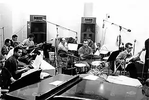 ![]() Members of the Wrecking Crew employed for a session at Gold Star Studios in the 1960s. Seated left to right: Don Randi, Al De Lory, Carol Kaye, Bill Pitman, Tommy Tedesco, Irving Rubins, Roy Caton, Jay Migliori, Hal Blaine, Steve Douglas, and Ray Pohlman. | |