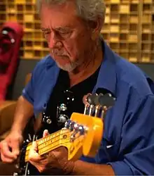 Guitarist and sometimes bassist Bill Pitman factored prominently in much of the Wrecking Crew's work.[70] For a brief time in the late 1950s he provided guitar lessons for a young Phil Spector, before Spector formed the Teddy Bears, who went on to record the surprise hit "To Know Him Is to Love Him" in 1958.[71] Pitman ended up playing on Spector-produced records in the 1960s such as "Be My Baby" by the Ronettes.[72] He can be heard on numerous hits from the period such as "The Little Old Lady (from Pasadena)" by Jan & Dean, and "Mr. Tambourine Man" by the Byrds.[73] Tommy Tedesco, born in an Italian family in Niagara Falls, New York, was another one of the Wrecking Crew's most renowned guitarists, playing along with Pitman on "Be My Baby" and "The Little Old Lady (from Pasadena)", as well as on the Champs "Limbo Rock".[74] He provided the flamenco-influenced guitar licks in the 5th Dimension's "Up and Away" as well as the guitar intro to the popular M*A*S*H theme.[75][76] Billy Strange was one of the top guitarists with the Wrecking Crew and played on hits such as "The Little Old Lady (from Pasadena)" and the Beach Boys' version of "Sloop John B".[77] In addition to playing sessions in Memphis, guitarist James Burton often recorded with the Wrecking Crew in Los Angeles in the 1960s.[78][79][80]