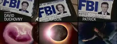 The series' original title sequence, crafted in 1993 during the show's first season had remained unchanged for seven seasons. With the partial loss of Duchovny after the seventh-season finale, the decision was made to update the credits, which were first featured in the premiere episode of season eight, "Within". The opening sequence now included new images, updated FBI badge photos for Duchovny and Anderson, and the addition of Patrick to the main cast. Duchovny's badge features in the opening credits only when he appears in an episode. The opening contains images of Scully's pregnancy and, according to Frank Spotnitz, shows an "abstract" explanation for Mulder's absence in this season, with him falling into an eye.[13]