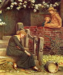 In the 19th century the story was taken up elsewhere. The American Symbolist, Albert Pinkham Ryder, painted his "Perrette" some time before 1890, taking its title from the name that La Fontaine gave his milkmaid. She walks abstractedly through a visionary landscape with the bucket balanced on her head.[21] The Spanish Joaquín Sorolla y Bastida painted his "The Milkmaid" in 1890 and portrays a pensive girl seated on a flowering bank with her bucket overturned beside her.[22] In Kate Greenaway's painting of 1893 she is seated instead on the steps of a cottage with the pail on the ground[23] in a treatment that has been described as Pre-Raphaelite.[24] In the following century, the fable is featured on one of Jean Vernon's (1897-1975) medals from the 1930s, where Perrette stands with a frieze of her lost beasts behind her.[25]