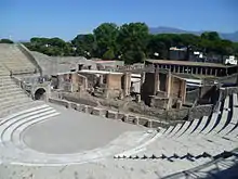The theatre area of Pompeii is located in the southwest region of the city. There are three main buildings that make up this area: the Large Theatre, the Odeon (small theatre), and the Quadriporticum. These served as an entertainment and meeting centre of the city.[1] Pompeii had two stone theatres of its own nearly two decades before the first permanent stone theatre was erected in Rome in the 50s BC.