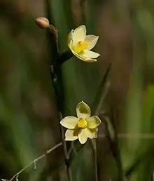 Thelymitra flexuosa, known as the twisted sun orchid,[2] is a species of orchid that is endemic to southern Australia. It has a single thin, wiry leaf and up to four cream-coloured to canary yellow flowers with four rows of short hairs on the back of the column. It is a common and widespread species, superficially similar to T. antennifera.