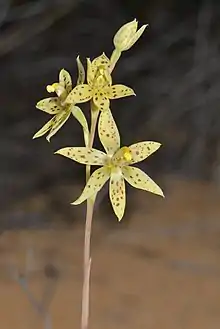Thelymitra sargentii, commonly called the freckled sun orchid,[2] is a species of orchid in the family Orchidaceae and is endemic to Western Australia. It has a single thick, leathery leaf and up to twenty five strongly scented, lemon yellow flowers with brown blotches. It grows in arid areas but where it receives runoff during rainfall.