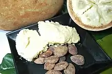 Cupuaçu butter is a triglyceride composed of saturated and unsaturated fatty acids, giving the butter a low melting point (approximately 30 °C) and texture of a soft solid, lending its use as a confectionery resembling white chocolate.[2] Main fatty acid components of cupuaçu butter are stearic acid (38%), oleic acid (38%), palmitic acid (11%) and arachidic acid (7%).[22][20]