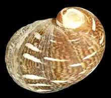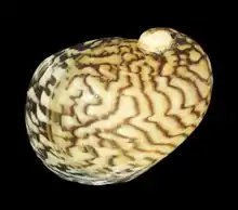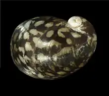 The exterior of the shell is basically whitish or yellowish, with a net-like dark reddish or violet pattern. This pattern is very variable (depending on environmental factors), sometimes partly presenting bands, and even occasionally being evenly dark.[5] The shell is very variable in color and color patterns, showing great polymorphism.[7] Shell coloration and patterns are very plastic in all species of the genus Theodoxus and these qualities may be influenced by factors like ionic composition of water, type of substratum and nutrition of individuals in various habitats.[44] Zettler and colleagues (2004)[18] showed that in the outer coastal waters of the Baltic Sea, the nearly black and often corroded shell form of Theodoxus fluviatilis is predominant, whereas in the inner (sheltered) parts of coastal waters, yellowish-green forms prevail.[44] Glöer and Pešić (2015) observed that specimens from a darker stony substrate were black or dark brown.[44] Shells of specimens of Theodoxus fluviatilis from Northern Europe are ornamented with a pattern of white, drop-like spots on a dark or red background.[44] Specimens from South France and Spain are ornamented with a pattern of zigzag stripes, while specimens from the Balkans show all possible combinations of white drop-like spots and zigzag stripes.[44] Animals from lacustrine habitats show dark or light bands on the shell.[44]