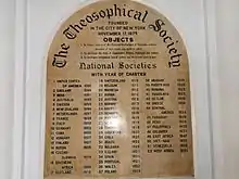 The Theosophical Society was officially formed in New York City, United States, on 17 November 1875 by Helena Petrovna Blavatsky, Colonel Henry Steel Olcott, William Quan Judge, and 16 others.[4] It was self-described as "an unsectarian body of seekers after Truth, who endeavor to promote Brotherhood and strive to serve humanity." Olcott was its first president, and remained president until his death in 1907. In the early months of 1875, Olcott and Judge had come to realize that, if Blavatsky was a spiritualist, she was no ordinary one.[5] The society's initial objective was the "study and elucidation of Occultism, the Cabala etc."[6] After a few years Olcott and Blavatsky moved to India and established the International Headquarters at Adyar, in Madras (now Chennai). They were also interested in studying Eastern religions, and these were included in the Society's agenda.[7]