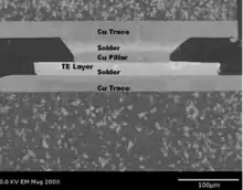 Figure 3 shows an SEM cross-section of a TE leg. Here it is demonstrated that the thermal bump is structurally identical to a CPB with an extra layer, the TE layer, incorporated into the stack-up. The addition of the TE layer transforms a standard copper pillar bump into a thermal bump. This element, when properly configured electrically and thermally, provides active thermoelectric heat transfer from one side of the bump to the other side. The direction of heat transfer is dictated by the doping type of the thermoelectric material (either a P-type or N-type semiconductor) and the direction of electric current passing through the material. This type of thermoelectric heat transfer is known as the Peltier effect. Conversely, if heat is allowed to pass from one side of the thermoelectric material to the other, a current will be generated in the material in a phenomenon known as the Seebeck effect. The Seebeck effect is essentially the reverse of the Peltier effect. In this mode, electrical power is generated from the flow of heat in the TE element. The structure shown in Figure 3 is capable of operating in both the Peltier and Seebeck modes, though not simultaneously.