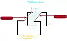Thermal ionization mass spectrometry (TIMS) is also known as surface ionization and is a highly sensitive isotope mass spectrometry characterization technique. The isotopic ratios of radionuclides are used to get an accurate measurement for the elemental analysis of a sample.[1] Singly charged ions of the sample are formed by the thermal ionization effect. A chemically purified liquid sample is placed on a metal filament which is then heated to evaporate the solvent. The removal of an electron from the purified sample is consequently achieved by heating the filament enough to release an electron, which then ionizes the atoms of the sample.[2] TIMS utilizes a magnetic sector mass analyzer to separate the ions based on their mass to charge ratio. The ions gain velocity by an electrical potential gradient and are focused into a beam by electrostatic lenses. The ion beam then passes through the magnetic field of the electromagnet where it is partitioned into separate ion beams based on the ion's mass/charge ratio. These mass-resolved beams are directed into a detector where it is converted into voltage. The voltage detected is then used to calculate the isotopic ratio.[3]