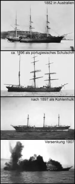 After her sale to Portugal, she was use as a naval training ship and renamed Pedro Nunes. On 13 October 1907, the Portuguese Navy towed her down the Tagus river and sunk by naval gunfire.[1]: 192
