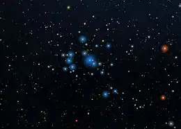 Theta Carinae is a single-lined spectroscopic binary with a 2.2 day period; the shortest known orbital period among massive stars, suggesting earlier mass transfer between the two components, possibly explaining the spectral peculiarities.[6] In this spectroscopic system, the primary star is probably a blue straggler, which is an unusual type of star created by merging or the interaction between two or more stars. The source of the mass transfer is likely to be the less massive secondary companion, and what is now is the primary star was probably originally the less massive component. The estimated age of the pair is 4 million years,[7] and it appears much younger than the surrounding IC 2602 cluster.[6]
