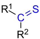 Thioketones (also known as thiones or thiocarbonyls) are organosulfur compounds related to conventional ketones in which the oxygen has been replaced by a sulfur.[1] Instead of a structure of R2C=O, thioketones have the structure R2C=S, which is reflected by the prefix "thio-" in the name of the functional group. Unhindered alkylthioketones typically tend to form polymers or rings.[2][3]