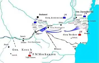The field marshal felt free to transfer the 1st Sofia Infantry Division, the German 217th Division (without the 9th Reserve Regiment) and most of the German artillery to Svishtov where they would join General Kosch's Danube Army in preparation to cross the Danube and advance in conjunction with the German Ninth Army against Bucharest. The remainder of the forces in Dobrudja were returned to General Toshev's command and ordered to dig in on a new defensive line between Lake Taşaul and the village of Boasgic (today Dunărea).