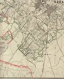 The EEF's occupation of Gaza was not strongly resisted and a general advance during the morning of 7 November found the town abandoned.[68] Orders for an attack at 04:50 by the 75th Division on Outpost Hill on the eastern side of Gaza had been issued; these were expanded to include Middlesex Hill and a 54th (East Anglian) Division attack on the Belah and Yunis trenches, and Turtle Hill in the coastal sector.[63][72][75] However, by 04:35, two battalions each from the 161st and the 162nd Brigades (54th Division) supported by artillery had already advanced to occupy Lion and Tiger Trenches and Sheikh Redwan in the coastal sector to the north-north-west of Gaza. The advance by the 162nd Brigade took them through "the gardens and fields of Gaza to the main road northwards", when patrols sent into the city found it deserted. British artillery had destroyed all the homes of the 40,000 people who had lived in Gaza before the war. The 54th (East Anglian) Division subsequently took up a line stretching from the Jaffa road north of Sheikh Redwan to the Mediterranean sea.[82][83]