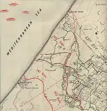 The EEF controlled the coastal sea lanes, and the Intelligence Service spread rumours about possible sea landings in the rear of Gaza. Ships were seen taking soundings off the coast and a fleet of small boats was located near Deir el Belah.[13] During the late afternoon of 1 November, an embarkation of members of the Egyptian Labour Corps onto motor launches, trawlers and tugs at Deir el Belah was staged as a feint, giving the appearance of continuing into the night. The next morning, two trawlers appeared off the mouth of the Wadi el Hesi north of Gaza.[14] To add to the confusion, between the Battle of Beersheba on 31 October and the main attacks at the Battle of Hareira and Sheria beginning on 6 November, the Ottoman left flank north of Beersheba was being fiercely contested during the Battle of Tel el Khuweilfe for control of the road to Hebron and Jerusalem. According to Wavell, "an assault on a portion of the Gaza defences was to be made by the XXI Corps."[13] The date of this attack, which was primarily a feint, was scheduled for between 24 and 48 hours before the attack on Sheria.[15]