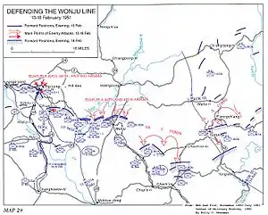As UN forces reeled under the attack on Hoengsong by the People's Volunteer Army (PVA) XIII Army Group and KPA V Corps, on 12 February U.S. X Corps commander General Edward Almond met with Eighth Army commander General Matthew Ridgway and advised him that he planned to give up Hoengsong and defend Wonju. His formal order issued late in the day called for the U.S. 2nd Infantry Division, with the 187th Airborne Regimental Combat Team attached, to defend a long line which from an anchor on the west at Chip’yong-ni stretched out to the southeast and east, passing 2 miles (3.2 km) north of Wonju and continuing 9 miles (14 km) beyond the town. In the right portion of the Corps' sector, the ROK 3rd and 5th Infantry Divisions were to stand between Route 29 and the Corps' east boundary some 7 miles (11 km) farther north. Placing the South Koreans on this forward line would tie the X Corps to the left of the ROK III Corps, whose line now bulged out to the north far beyond the X Corps front. To back up the South Koreans and secure the Corps' east flank in depth, the 31st Infantry Regiment of General Ferenbaugh’s 7th Infantry Division was to occupy positions at Todon-ni, a road junction 4 miles (6.4 km) below Pyongchang. Ferenbaugh's 32nd Infantry Regiment, still holding positions between Chech’on and Yongwol, would lend further depth, and the 17th Infantry Regiment, now scheduled to assemble in Corps reserve near Wonju, could be committed to help. To improve control, Almond requested that the ROK I Corps headquarters be attached to X Corps to take charge of the ROK 3rd and 5th Divisions. General Kim Hong-il and his staff, by virtue of past service under Almond in northeastern Korea, were experienced in joint operations and were well acquainted with the X Corps staff. Ridgway approved. He arranged to have General Kim and a partial staff flown into the X Corps sector on the 13th and to have Kim's remaining staff follow by truck. The ROK Capital Division, in the meantime, was to pass to ROK III Corps control.[1]