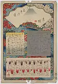 Thirty-six Views of Mount Fuji (Japanese: 富士三十六景, Hepburn: Fuji Sanjū-Rokkei) is the title of two series of woodblock prints by Japanese ukiyo-e artist Hiroshige, depicting Mount Fuji in differing seasons and weather conditions from a variety of different places and distances. The 1852 series, published by Sanoya Kihei, are in landscape orientation using the chūban format, while the 1858 series are in the portrait ōban format and were published by Tsutaya Kichizō.[1][2] The same subject had previously been dealt with by Hokusai in two of his own series, Thirty-six Views of Mount Fuji, produced from c. 1830 to 1832,[3] and One Hundred Views of Mount Fuji, published in three volumes from 1834 to 1849.[4]