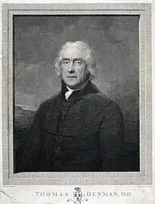 Thomas Denman, the elder, M.D. (1733–1815) was an English physician. He was the second son of John Denman (or Thomas[2]), an apothecary born at Bakewell, Derbyshire, on 27 June 1733. After a career in naval medicine he made a considerable amount of money in midwifery. The phenomenon of Denman's spontaneous evolution, by which a spontaneous impaction of the shoulder of a foetus resolves a difficult transverse delivery during childbirth, is named after him.[3] He used his authority to support inducing premature labour in cases of narrow pelvis and other conditions in England (where the mother's life is imperiled by delivery at the full-time).[1]