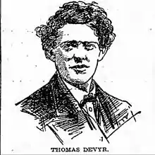 Thomas Devyr was born in 1844 in Brooklyn, New York.[1] His father was Thomas Ainge Devyr, an Irish political journalist and activist involved in the Chartism movement in Ireland. In 1840, he and his family fled the country to the United States when threatened with imprisonment.[1] The family settled into Williamsburg neighborhood of Brooklyn, New York,[2] where the elder Thomas became an influential progressive writer and newspaper editor.[1] He founded the first daily newspaper in the area's history, the Williamsburgh Daily Post.[2] The Devyr family included five sons, and two daughters,[2] and younger Thomas' middle initial has been noted as either an A or an H, depending on the source.[1]