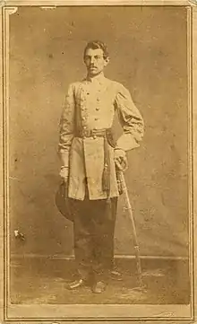 Jones was appointed aide de camp to General John Brown Gordon and accompanied the Army of Northern Virginia during the Gettysburg Campaign, including as a messenger when Gordon requested permission to attack Cemetery Ridge but was denied during the Battle of Gettysburg. Jones also fought in the Siege of Petersburg, the Battle of the Wilderness, and the Battle of Spotsylvania Court House. Jones also fought with Gordon during Jubal Early's campaign that reached the outskirts of Washington DC and at the defeats during the Third Battle of Winchester and the Battle of Cedar Creek in late 1864. During the Battle of Cedar Creek, both sides respected Jones's courage for rescuing a girl caught in the crossfire between armies. He also received praise for rescuing a wounded Ohio soldier. Thus, Jones fought in the Confederate States Army from 1862 to 1865, rising to the rank of major. On April 9, 1865, he physically carried the truce flag on his sword while under fire delivering Lee's surrender, and he witnessed the final ceremony at Appomattox Court House.[7]