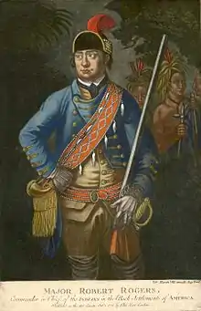 When General Amherst left North America in 1763, it was on a leave of absence from his position as commander-in-chief. In 1764, Amherst announced that he had no intention of returning to North America, at which point Gage's appointment to that post was made permanent. (Amherst retained posts as governor of Virginia and colonel of the 60th Foot, positions he only gave up in 1768 when he was required to actually go to Virginia or give up the post.)[43] Intrigues of other high-ranking officers, especially Robert Monckton and his supporters, for his offices, continued throughout his tenure as commander-in-chief. Gage was promoted to lieutenant general in 1771.[44] In 1767 Gage ordered the arrest of Major Robert Rogers, the former leader of Rogers' Rangers who Gage had come to dislike and distrust during the war. The arrest was based on flimsy evidence that Rogers might have been engaging in a treasonous relationship with the French; he was acquitted in a 1768 court martial.[45]