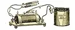 The main reason for this idea of having stationary batteries in one place away from the locomotive was so the batteries would not be damaged, which usually happened when the batteries were mounted in the moving vehicle. This toy electric train was sold as a scientific apparatus.[22] The electric power was furnished by two Grove battery cells that were wired directly to the rails the locomotive was riding on. The electric power to run the engine was picked up off the tracks through the steel wheels, with one track having the positive charge and the other track having the negative charge.[19] In 1860 he exhibited on a circular track in Quincy Hall in Boston an advanced version of this model train called the Volta that was constructed like a steam locomotive.[3] This time the direct current electric power was furnished from a dynamo generator instead of batteries and that machinery after the exhibition went to the physical laboratory at Harvard College.[12]