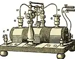 Hall with George W. Palmer bought out Davis's business in 1848 and formed Palmer & Hall. In 1856 he bought out Palmer's interest and the business was then known as Thomas Hall / Magnetical & Telegraphic Instrument Maker.[4] That firm continued business until 1892 when Hall brought into the firm a son and the name became Thomas Hall & Son. Their place of business was 19 Bromfield Street in Boston. There they made all kinds of electromagnetic apparatus and school experimentation equipment for physics and chemistry classes.[5] They also made electric devices for medical use including Hall's New French Battery.[6]
