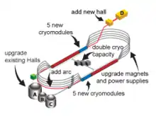 ![]() Schematic of the accelerator and the experimental halls after the 12 GeV energy upgrade. | |