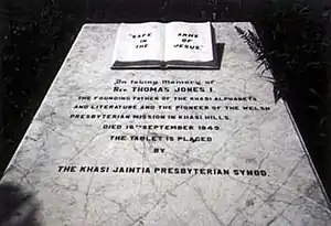 Thomas Jones (24 January 1810 – 16 September 1849)[1] was a Welsh Christian missionary, who worked among the Khasi people of Meghalaya and Assam in India and of Bangladesh. He recorded the Khasi language in Roman script, and the inscription on his gravestone calls him "The founding father of the Khasi alphabets and literature".