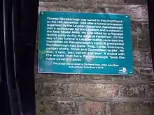 In October 1648, Rainsborough was sent by his commander, Sir Thomas Fairfax, to the siege at Pontefract Castle. Whilst he was in nearby Doncaster, he was killed by four Royalists during a bungled kidnap attempt. The site is still marked today by a plaque outside of the House of Fraser. As Rainsborough was under Cromwell's disfavour and there were tensions between Rainsborough and the commander he was displacing, Henry Cholmeley, who later defected to the Royalists, many at the time wondered whether there was some Parliamentary complicity in his death, as do historians today.[7] However Royalist Propaganda may also have played a part in all the rumours. The four Royalists involved in the bungled kidnap crossed the River Don at Mexborough and hid out at Conisborough Castle before their failed attempt.