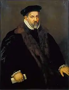 From 1574 to 1577, Wilson, who had now become a prominent person in the diplomatic world, was principally engaged on embassies to the Low Countries, and on his return to England he was made a privy councillor and sworn secretary of state; Francis Walsingham was his colleague.[6] In 1580, despite his being not in holy orders, Queen Elizabeth appointed Wilson Dean of Durham. He died at St Katherine's Hospital on 16 June 1581, and was buried next day, "without charge or pomp", at his express wish.[10]