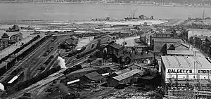 It was built on land reclaimed in 1882. The company was allocated 19 of the 30 acres of reclamation made with spoil from the tunnels. Davis Street was extended in a dogleg across the reclamation to the new Thorndon Esplanade since covered by Aotea Quay. Road access to Thorndon station was from it but Davis Street Extension was eventually reduced to a driveway to the station's generous forecourt.