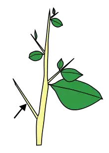 In common language the terms are used more or less interchangeably, but in botanical terms, thorns are derived shoots (so that they may or may not be branched, they may or may not have leaves, and they may or may not arise from a bud),[1][2][3][4] spines are derived from leaves (either the entire leaf or some part of the leaf that has vascular bundles inside, like the petiole or a stipule),[1][2][3][4] and prickles are derived from epidermis tissue (so that they can be found anywhere on the plant and do not have vascular bundles inside[4]).[1][2][3]
