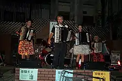 The concept behind Those Darn Accordions was initially conceived by keyboardist and accordionist Linda "Big Lou" Seekins in early 1989.[1] Seekins, who was active in several Bay Area bands including the polka punk band Polkacide, was called up by the owner of San Francisco's Paradise Lounge and offered an open performance slot if she could put together a band in time.[2] As a joke, she contacted every accordionist she knew in an attempt to assemble an all-accordion band, ultimately recruiting thirteen accordionists to play the show, where they sight read "Beatles songs and polkas" before a packed house.[3][4][5] Despite the disorganized and under-rehearsed nature of the band, the audience response was tremendous: "everyone liked us so much that they wanted an encore, and we'd already played everything we knew", Seekins recalled, "so we just had to play a song over again".[6] Almost immediately, what was originally intended to be a one-time gag started developing into plans to become an ongoing project.[2]