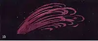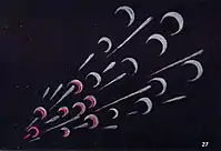 The authors state that when a person is suddenly frightened, then has a place the effect shown in Fig. 27. It is emphasized that "all the crescents" on the right, which apparently have been emitted earlier than others, do not show anything other than "the livid grey of fear; but a moment later the man is already partially recovering from the shock, and beginning to feel angry that he allowed himself to be startled." The later crescents have changed to scarlet, and it evidences the "mingling of anger and fear," while the last crescent is quite scarlet, and it shows that "already the fright is entirely overcome, and only the annoyance remains."[60][note 30]