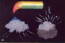 The authors explain that the thought-form in Fig. 30 on the left shows an attempt to find "solace in prayer," and in this way overcome fear. This can be seen under a grayish-blue color, "which lifts itself hesitatingly upwards." Yet it is seen that judging by "the lower part of the thought-form, with its irregular outline and its falling fragments, that there is in reality almost as much fright here" as in the case on the right. Thus, one person has a chance to restore "self-control," while the other remains "an abject slave to overwhelming emotion." The thought-form at upper has been created by a member of the ship crew responsible for the lives of passengers, and it demonstrates a "very striking contrast" of the weakness manifesting in two forms from below. Herein shown "a powerful, clear-cut and definite thought, obviously full" of energy and determination. Orange color speaks of his confidence in ability to manage with the difficulty. The "brilliant yellow" means that his intellect is already at work upon the problem.[68][note 33]