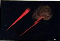 Fig. 22 and 23 are thought-forms of a "murderous rage" (on the right) and a "sustained anger" (on the left). The first form was taken "from the aura of a rough and partially intoxicated man in the East End of London," when he was knocking down a woman; a flare flashed in her direction, triggering an explosion of horror—she recognized that one would be struck. In the same illustration drawn a "stiletto-like dart" directed to the lower left corner: it is a thought "of steady anger, intense and desiring vengeance, of the quality of murder, sustained through years, and directed against a person who had inflicted a deep injury on the one who sent it forth."[56][note 25][note 26]