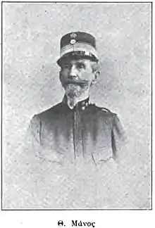 He retired with the rank of major general on 29 January 1918, and died at Athens in 1922.[1] He was the father of the politician and poet Konstantinos Manos, and the army officer Petros Manos,[1] who was the father of Aspasia Manos, the consort of King Alexander of Greece.